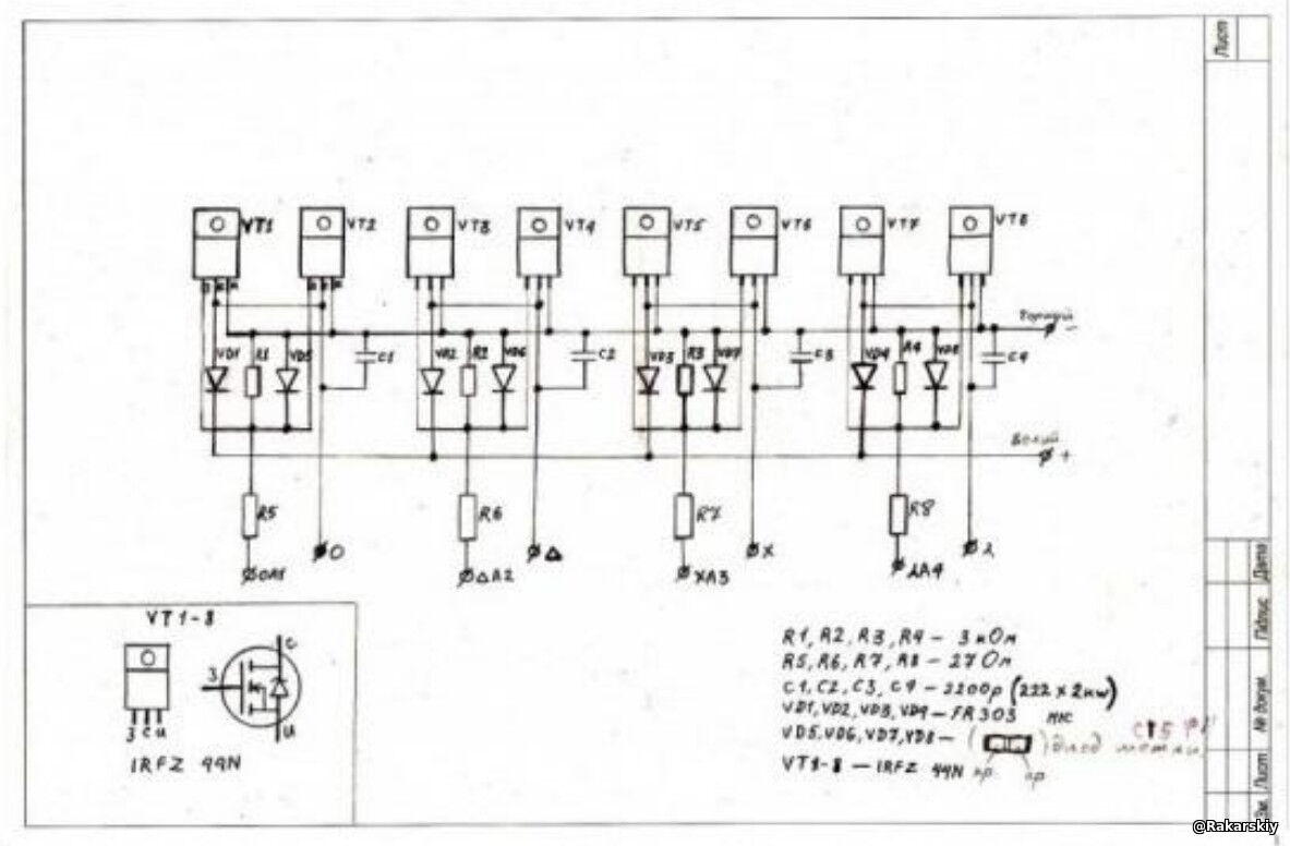 На мою думку, переріз дроту вихідної схеми в котушках має бути більшим, ніж у обмотках push-pull. Це необхідно для зменшення опору вихідної обмотки. Після вимкнення транзистора існує часовий інтервал між активацією датчика Холла, під час якого діятиме імпульс самоіндукції, тому для збільшення струму в колі необхідно зменшити опір джерела, тобто вихідної обмотки. Це необхідно для виконання формули струму замкненого кола.