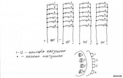 Цей напис некоректний. Котушки мають виготовлятися з існуючих магнітів за швидкістю внутрішніх магнітів на 12 вольт, зовнішніх для 24 вольт. Діаметр зовнішніх котушок має приблизно дорівнювати діаметру магніту.
