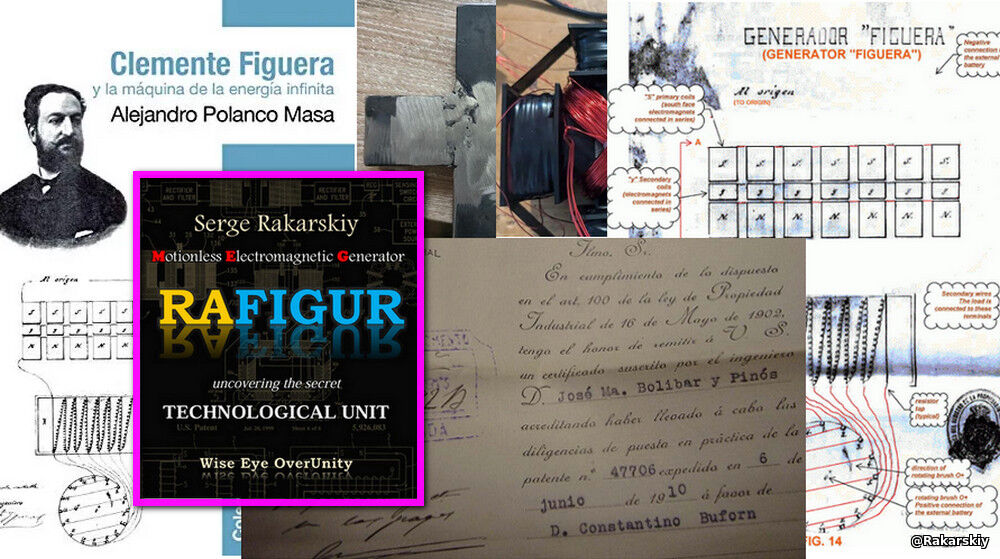 У 1902 році іспанський інженер Клементе Фігерас оголосив про створення електромагнітного генератора без рухомого/обертового магнітного ротора. Це вирішило проблему генерації електроенергії без використання механічної сили, адекватної генерованій електричній потужності. Реальність існування такого електромагнітного генератора була підтверджена інженерами, найнятими фінансовим картелем для вивчення продукту, щодо якого інженер Фігерас вступив у переговори. Така угода була укладена. Ми не знаємо подробиць і не знаємо, чому подальшого продовження не було. Ймовірно, що покупка була зроблена для нейтралізації загрози тим, хто генерував електроенергію за допомогою електромеханічних пристроїв. У 1908 році інженер Фігерас подав ще одну заявку на патент. Це, безсумнівно, було нове рішення. Клемент Фігерас не дожив до публікації нового патенту. Його роботу продовжив його колега Константіно де Буфорн Хакас, який опублікував кілька патентів. У 1910 році він, ймовірно, продемонстрував працюючий генератор експертам з патентного відомства. Я особисто не маю сумнівів, що винахід є реальним і працює. Я проводив дослідження в галузі електромагнітних генераторів без рухомих частин, навіть не думаючи, що мої шляхи перетнуться з винаходами талановитого інженера Фігераса. Ця публікація присвячена розкриттю деталей конструкції та виготовлення другої версії генератора Фігераса. Є два видання англійською та українською мовами. Wise Eye OverUnity: Motionless Electromagnetic Generator "RAFIGUR"