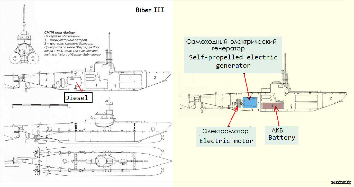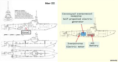 Таке в Німеччині тільки почало розвиватися до кінця війни. Підводний човен класу Biber мав обтічну форму і був посилений чотирма міцними перегородками, що розділяють човен на п'ять відсіків, і декількома плоскими ребрами жорсткості з відстанню між ними близько 25 см. Тут же були зосереджені всі важелі і прилади управління підводного човна, а також балони зі стисненим повітрям для продувки основних баластних цистерн, кисневий балон з дихальним апаратом, акумуляторні батареї, паливний бак і бензопроводи. Двигун розташовувався між другою і третьою міцними перегородками в третьому відсіку, а електродвигун для підводних подорожей знаходився в четвертому відсіку. У п'ятому відсіку знаходився кормовий бак основного баласту. Для підводних подорожей використовувався 13-сильний електромотор, що живиться від трьох груп акумуляторів типу 13 Т2106: двох - по 26 елементів і однієї з двох батарей по 13 елементів. В якості рушія на підводному човні використовувався гребний гвинт діаметром 47 см. Екіпаж підводного човна складався з однієї людини. Місце водія розташовувалося в другому відсіку підводного човна. Небезпеку для водія підводного човна становив токсичний вихлоп надводного бензинового двигуна. Причому кількість чадного газу була настільки великою, що після 45 хвилин роботи двигуна при закритому люку бойової вежі його концентрація всередині корабля стала критичною. Водій Biber міг втратити свідомість будь-якої миті від отруєння вихлопними газами. Тому, щоб видалити вуглекислий газ, водієві доводилося надягати на обличчя маску дихального апарату і видихати через шланг, що веде до оксилітового картриджа. Всього таких патронів у водія було три, кожен з них розрахований на 7,5 годин. Кисню, що поставляється певними дозами, вистачало на 20 годин занурення з аквалангом. Розвиток конструкції Biber призвів до появи підводного човна Biber II. Корпус був довшим (товщина обшивки 4 мм) - екіпаж підводного човна складався з двох осіб. Проект не зійшов зі стадії «паперового». Також відбувся проект третьої моделі Biber III. Випробування моделі почалися в січні 1945 року і були завершені в кінці березня 1945 року, але швидко відступаючий фронт не дозволив завершити розробку цього проекту. У цих човнах силова установка вже була електричною. Дизель закрутив генератор, тільки на поверхні. Чи могли німецькі інженери сконструювати систему отримання електричного струму, засновану на непаливному принципі ROTOVERTOR?Великої установки на мегавати немає, а ось для маленького класу човнів такого типу маленька, цілком. Думаю, цю інформацію незаслужено відносять до класу «Міфи Другої світової війни». Адже завдання полягало не в тому, щоб запалити лампочки. Розміщення самохідного електрогенератора замість дизельної установки, знижує ємність акумуляторів, збільшує запас інших компонентів життєзабезпечення екіпажу, ідеальної зброї в підводній війні. Приклад зміни показника, по суті, у виробничій лінії нічого не змінюється, тільки оптимізує.