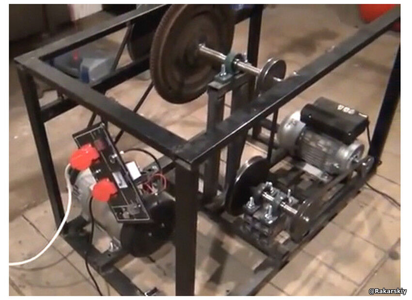 Нещодавно пан Час Кемпбелл з Австралії продемонстрував приріст електроенергії за допомогою розробленої ним системи маховика. По суті, він обертає мережевий двигун, належним чином передає його через трансмісію, яка включає десятикілограмовий маховик, щоб він обертав генератор змінного струму з оптимальною швидкістю трохи більше трьох тисяч обертів на хвилину. Коли система працює на повній швидкості, Час перемикає мережевий двигун так, щоб він живився від виходу генератора. Це працює дуже добре і дозволяє його автономній системі живити інші інструменти, такі як дрилі. Це домовленість:[/font]