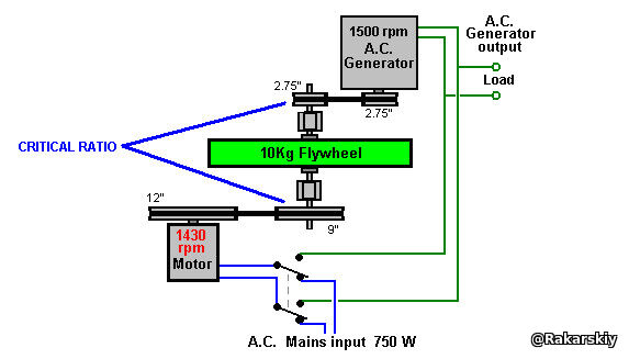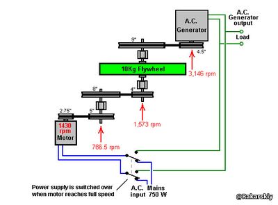 Джейкоб стверджує, що дуже важливою особливістю для високої продуктивності з системою такого типу є співвідношення діаметрів ведучого та злітного шківів на валу, який містить маховик, особливо в системах, де маховик обертається з високою швидкістю. Ведучий шків повинен бути в три-чотири рази більшим за шків відбору потужності. Використовуючи двигун Chas’ 1430 об/хв і загальнодоступний генератор зі швидкістю 1500 об/хв, підйом маховика 12:9 забезпечує задовільну швидкість генератора, забезпечуючи при цьому співвідношення 3, 27 між ведучим шківом діаметром 9 дюймів і шківом відбору потужності діаметром 2, 75”. Якщо використовується генератор, який був розроблений для використання вітрогенератором і який має пікову вихідну потужність лише 600 об/хв, тоді можна досягти ще кращого співвідношення діаметрів шківа. Патрік Келлі.