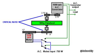 ]Ви помічаєте, що у нього не тільки важкий маховик достатнього розміру, але й три-чотири інші диски великого діаметру, встановлені там, де вони також обертаються з проміжними швидкостями обертання. Хоча ці диски, можливо, не були розміщені там як маховики, тим не менш, вони діють як маховики, і кожен з них сприятиме отриманню вільної енергії системою в цілому. Відео акуратної реплікації з вхідною потужністю 750 Вт і вихідною потужністю 2340 Вт тут і ця реалізація, здається, не має важкого маховика, як ви можете бачити з цього малюнка, хоча найбільше колесо шківа виглядає так, ніби воно містить значну вагу: